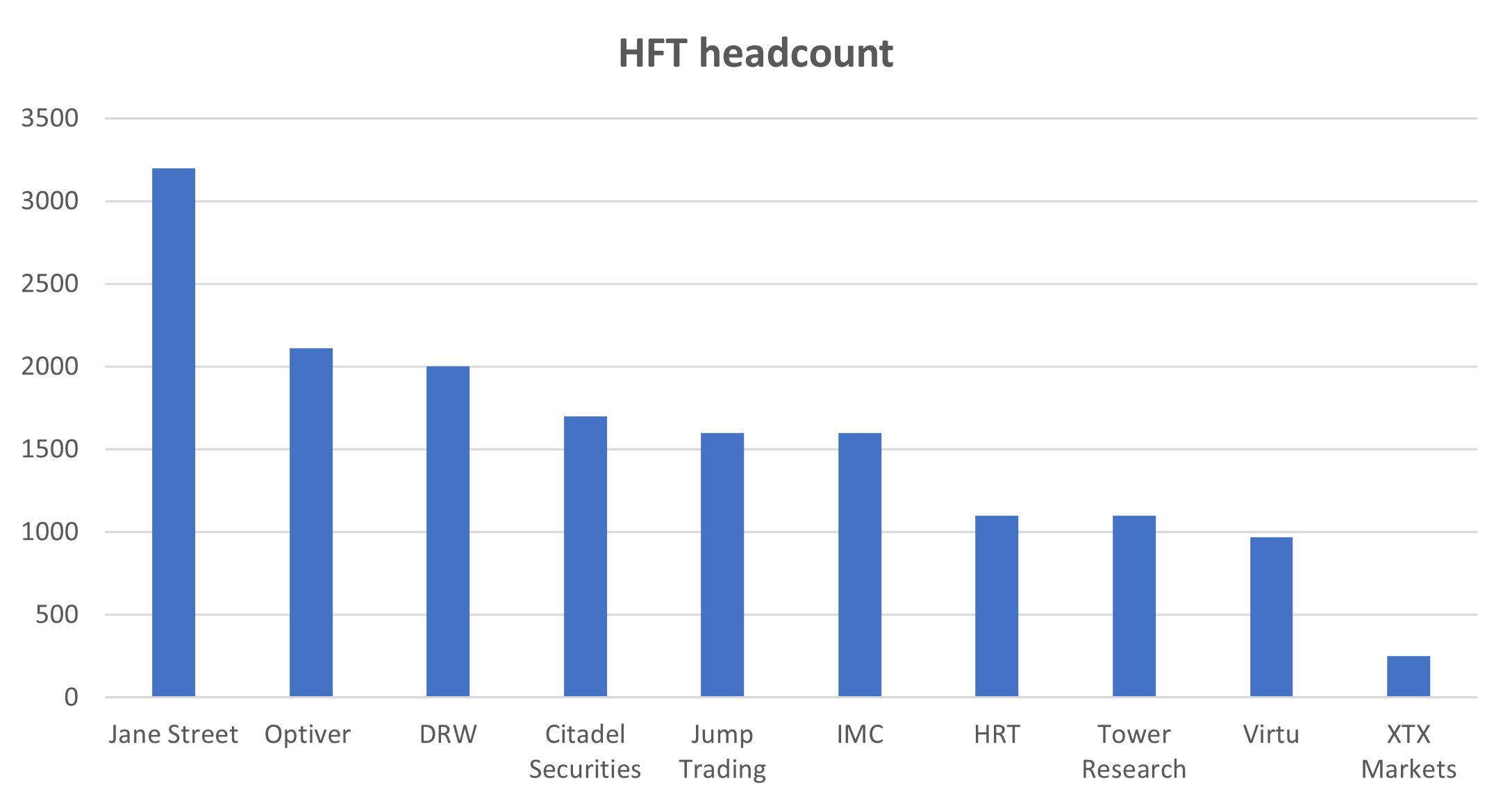 HRT has grown its headcount faster than others, but is also doing more with it. HRT’s first half revenues of $5.3 billion, even adjusting for some seasonality in the second half, would imply an eye-popping revenue per employee of $8-10 million. This is within a whisker of the mighty Jane Street and around 40% above Citadel Securities. It would also be well above the $3.5 million per employee of Virtu or circa $2 million per employee of the Dutch electronic market makers (Optiver and IMC).